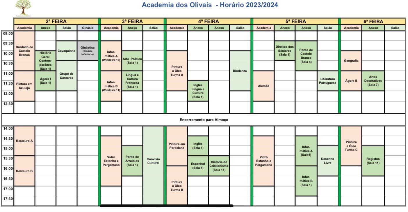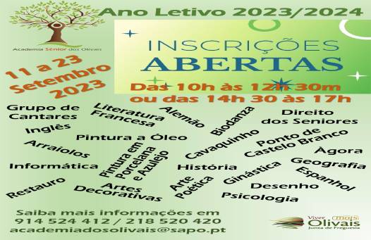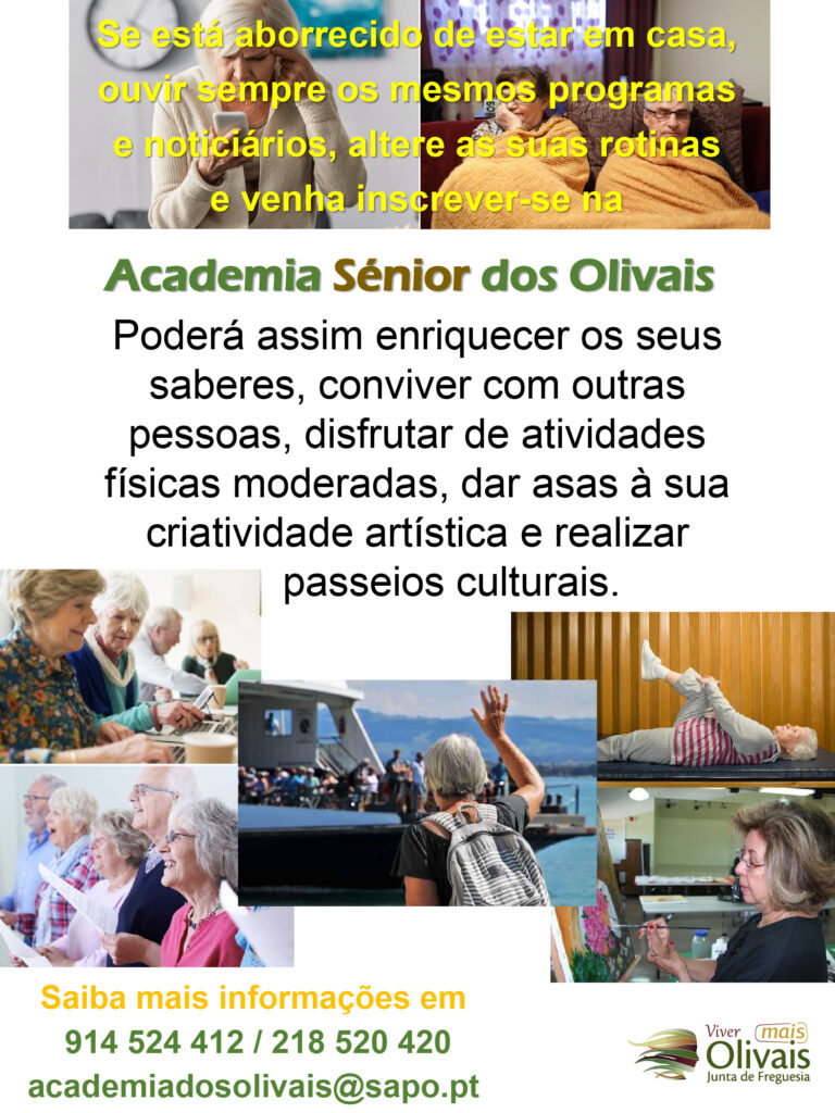 Está farto da rotina? Passar as manhãs em casa, ouvir sempre os mesmos programas? Venha daí e inscreva-se na Academia Sénior dos Olivais que proporciona aulas diversas: Grupo de Cantares, Inglês, Pintura, Informática, Restauro, Arraiolos, Literatura, Biodanza entre tantas outras! 𝐀𝐬 𝐢𝐧𝐬𝐜𝐫𝐢𝐜̧𝐨̃𝐞𝐬 𝐭𝐞𝐫𝐦𝐢𝐧𝐚𝐦 𝐧𝐨 𝐝𝐢𝐚 𝟐𝟑 𝐝𝐞 𝐬𝐞𝐭𝐞𝐦𝐛𝐫𝐨! Saiba mais através dos telefones 914 552 412 | 218 520 420 ou através do e-mail academiadosolivais@sapo.pt  Inscreva-se! Porque 𝐨 𝐬𝐚𝐛𝐞𝐫 𝐧𝐚̃𝐨 𝐨𝐜𝐮𝐩𝐚 𝐥𝐮𝐠𝐚𝐫!